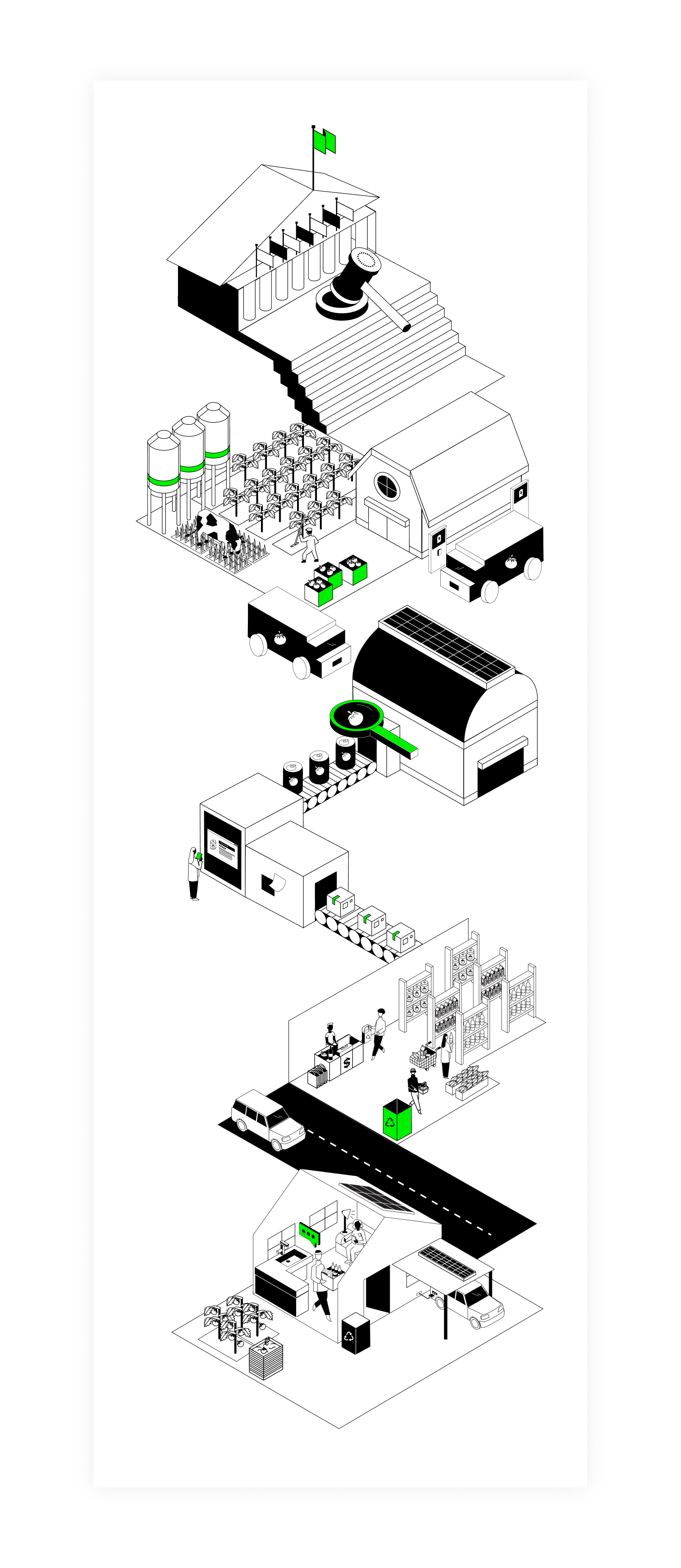 One use case for the illustration style was a page I designed, which detailed NIQs commitment to sustainability. I reworked some of the elements from the initial illustration, as well as developing my own peices for the site.