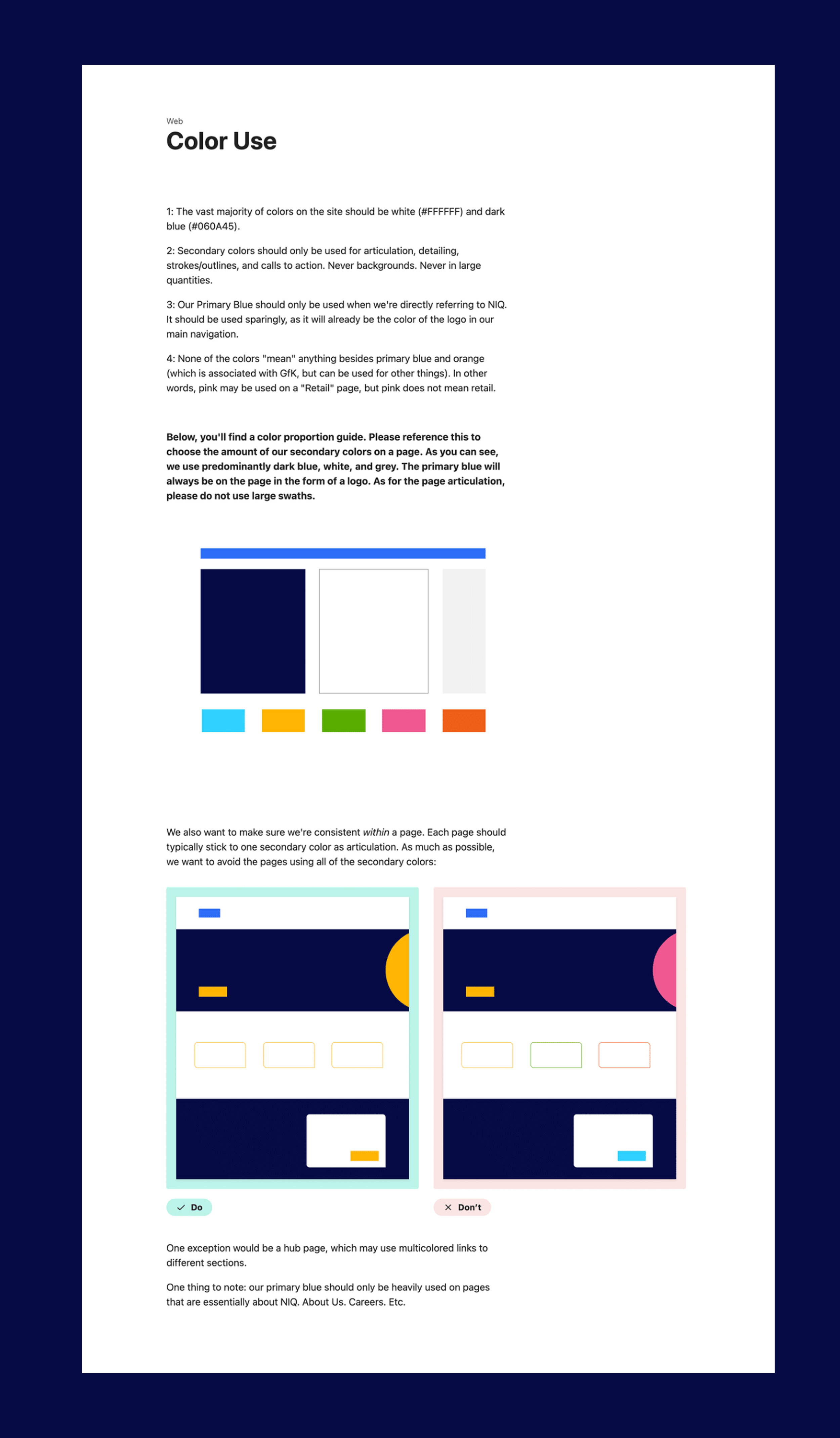 Below, you’ll find some of the extensive brand guidelines I wrote. These had to serve the function of documenting our new online branding, while also educating NIQ employees on basic design principles, as we had many non-designers building web pages.